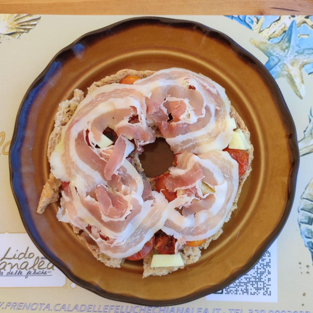 Frisella al finocchio condita con olio ,sale ,Pecorino, Pancetta e pomodorino