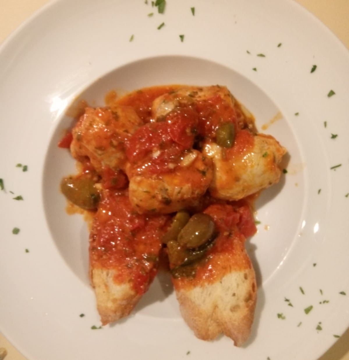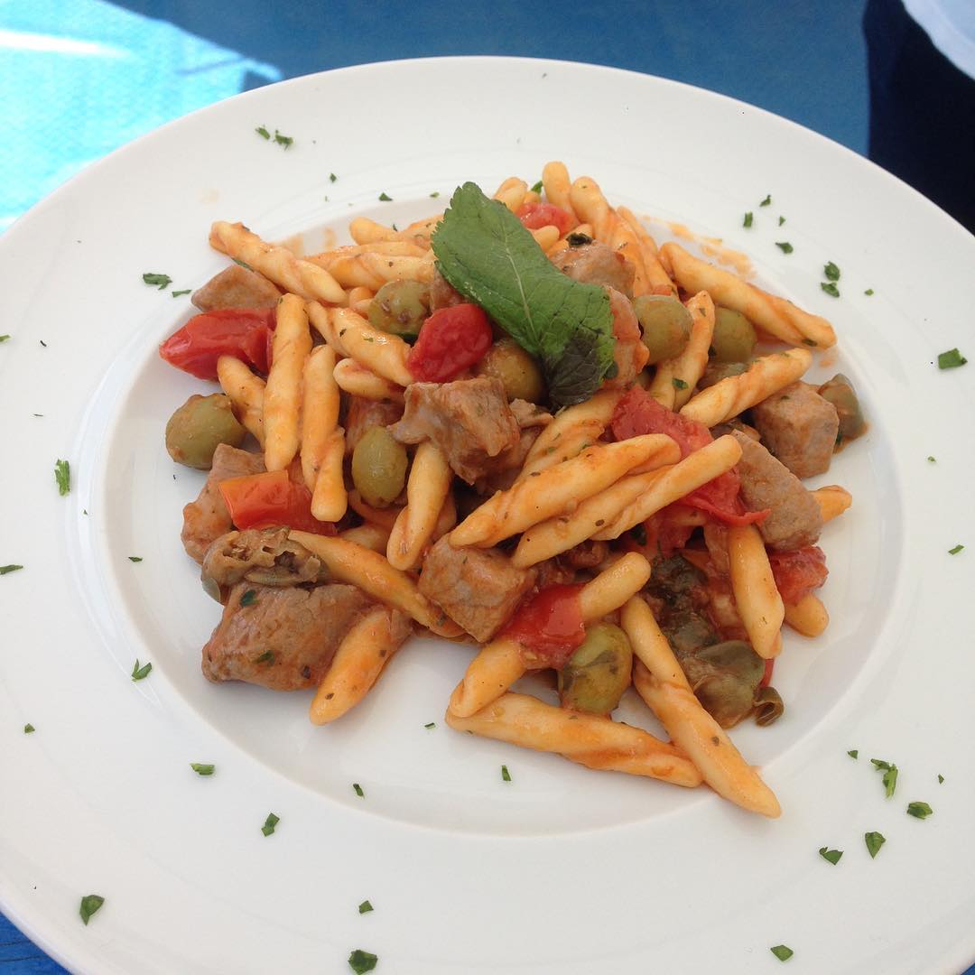 Pasta fresca strozzapreti o trofie con salsa di pomodoro fatta in casa ,olive, capperi e pesce spada o tonno o aricciola - Secondo il pescato del giorno