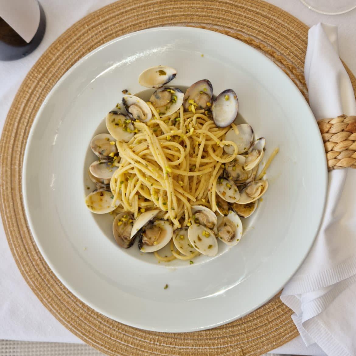Linguine pastificio garofalo, pesto di pistacchio fatto in casa , vongole