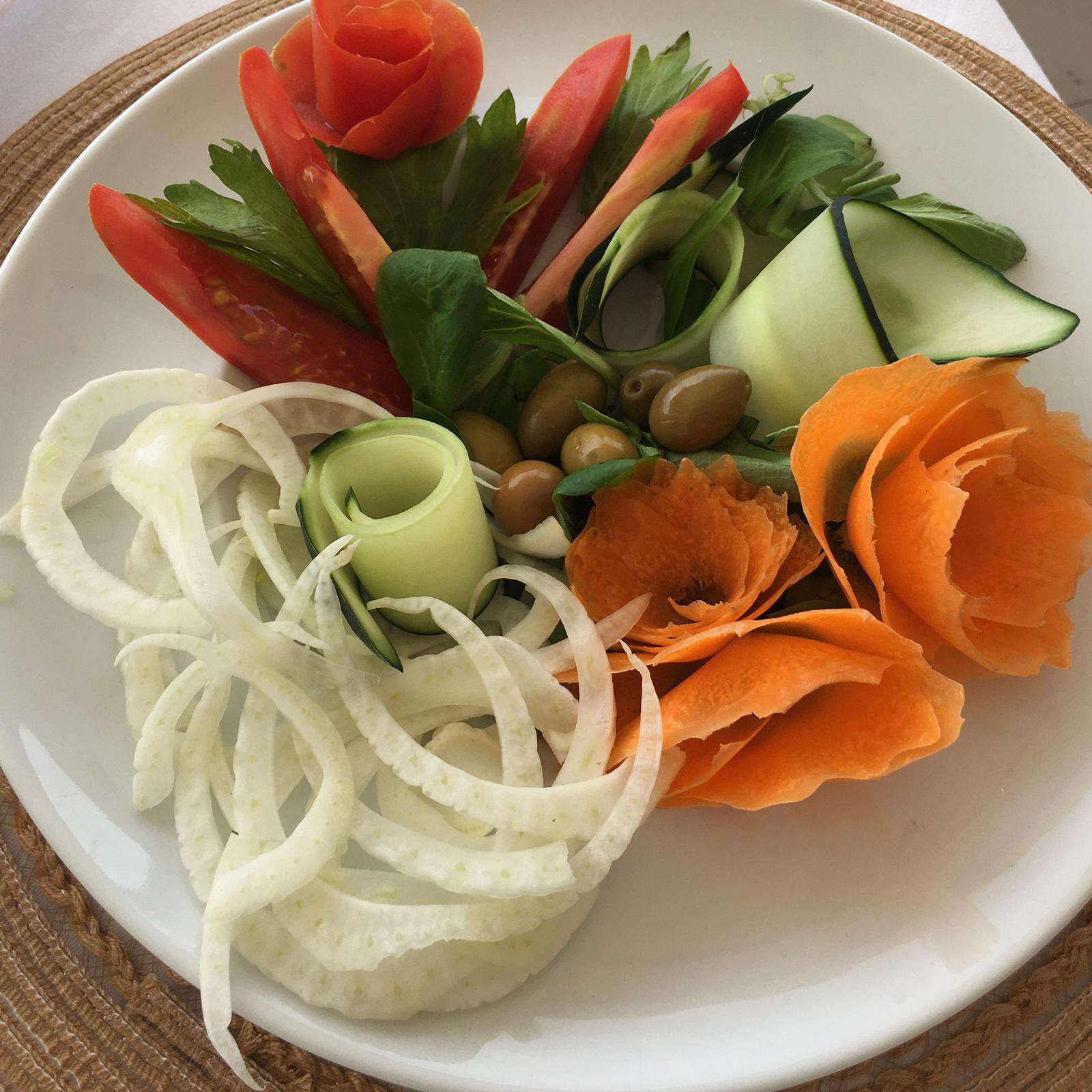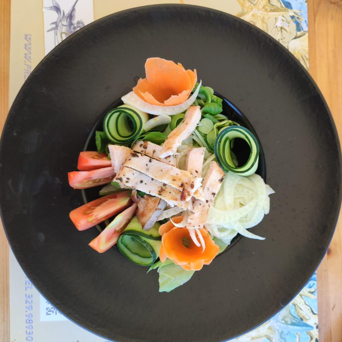 Cetrioli,sedano,valeriana,olive e limone , condita olio e sale accompagnata da Salsa alle erbe.