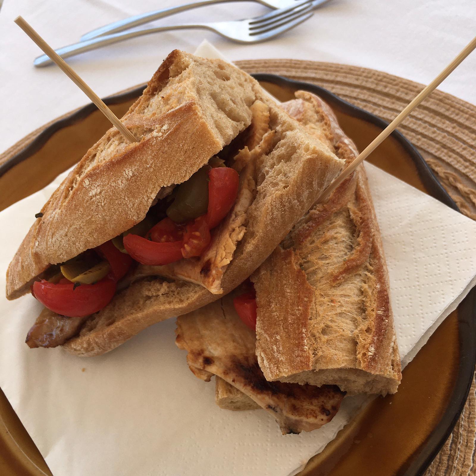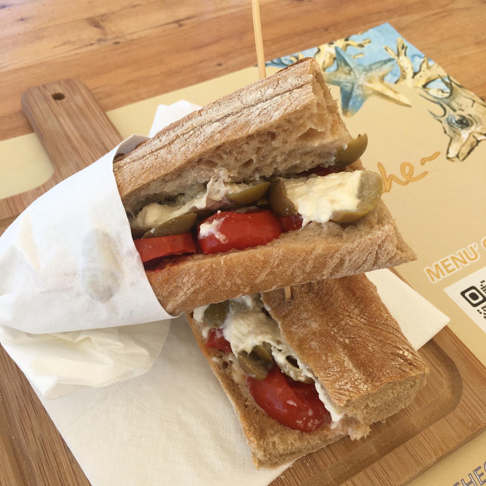 Pane tipo sfilatino rustico pesce spada pomodoro confit,lattuga e pate olive .