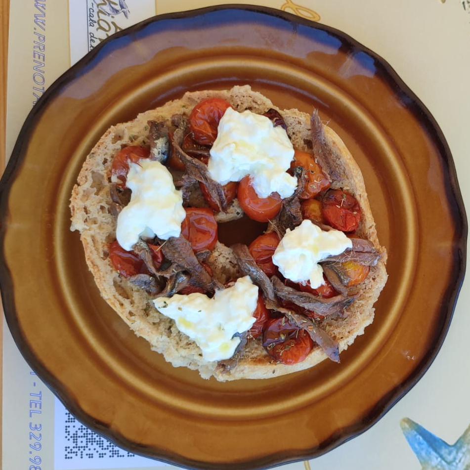 Frisella,sale ,olio ,pomodori confit,stracciatella, e alici sott'olio.